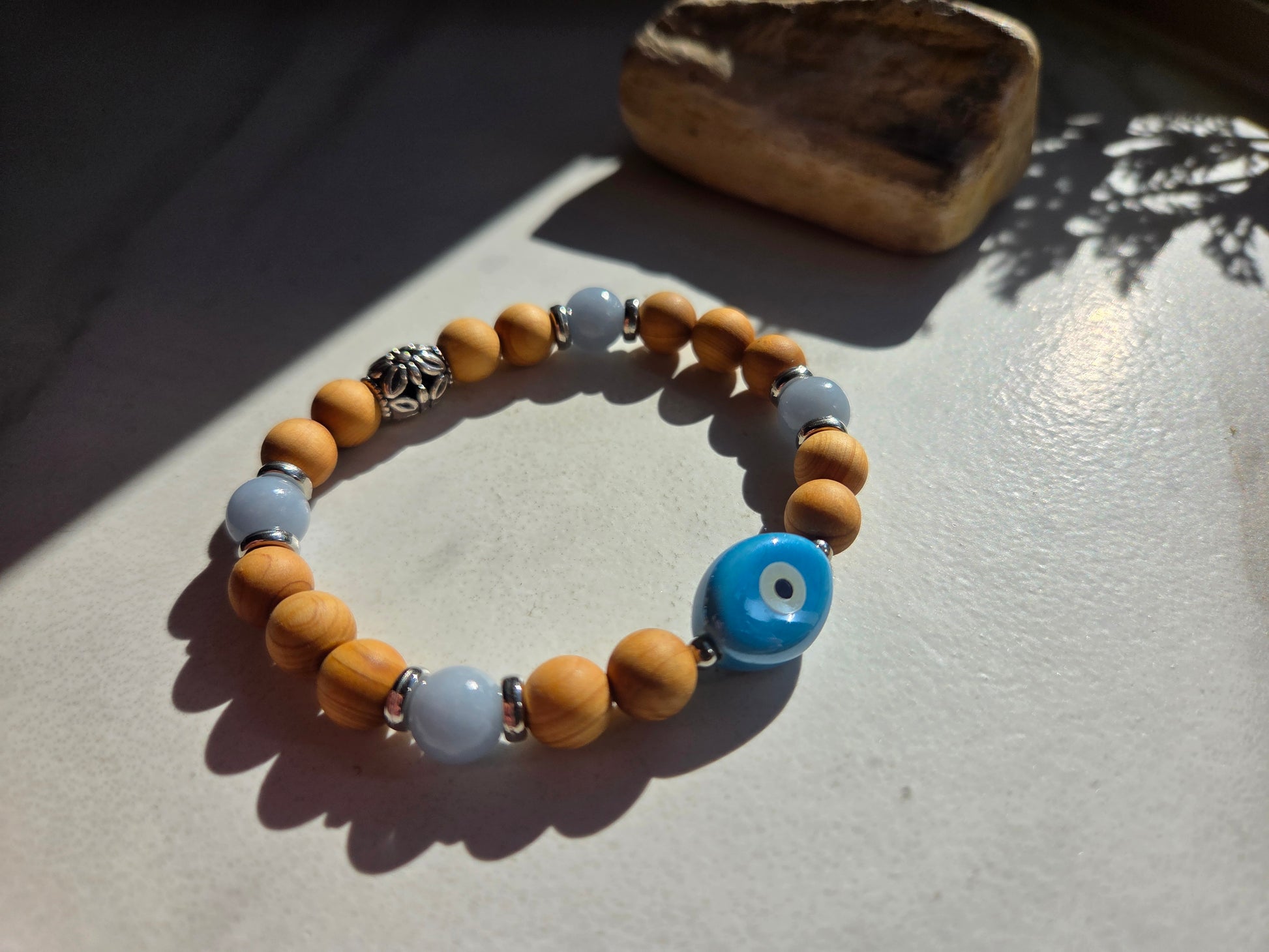 This handcrafted bracelet blends soothing energy with protective symbolism, making it both beautiful and meaningful. Designed on a durable stretch cord, it combines natural stones and sacred symbols for everyday wear.