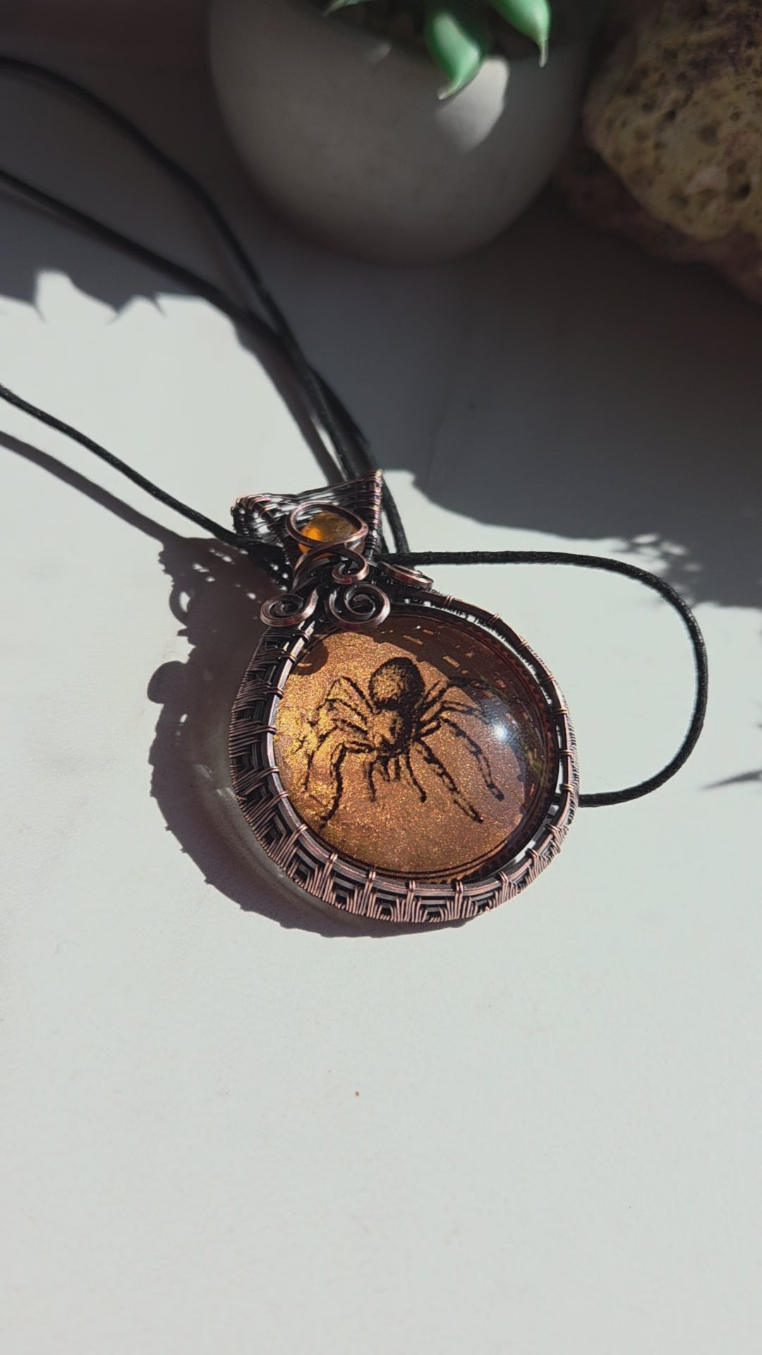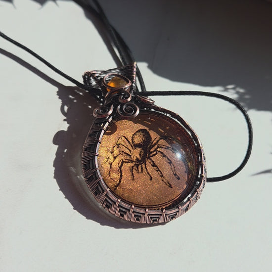 This unique handmade necklace combines artistry, symbolism, and spiritual energy in one striking piece. At its center rests a detailed glass spider cabochon, backed with shimmering copper mica and sealed with a smooth resin flood coat for lasting brilliance. Faceted Carnelian stones accent the design, their warm fiery tones beautifully complemented by the antiqued copper wire wrap. The necklace is finished on an adjustable sliding knot cotton cord, making it easy to wear at your desired length.