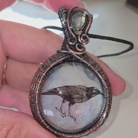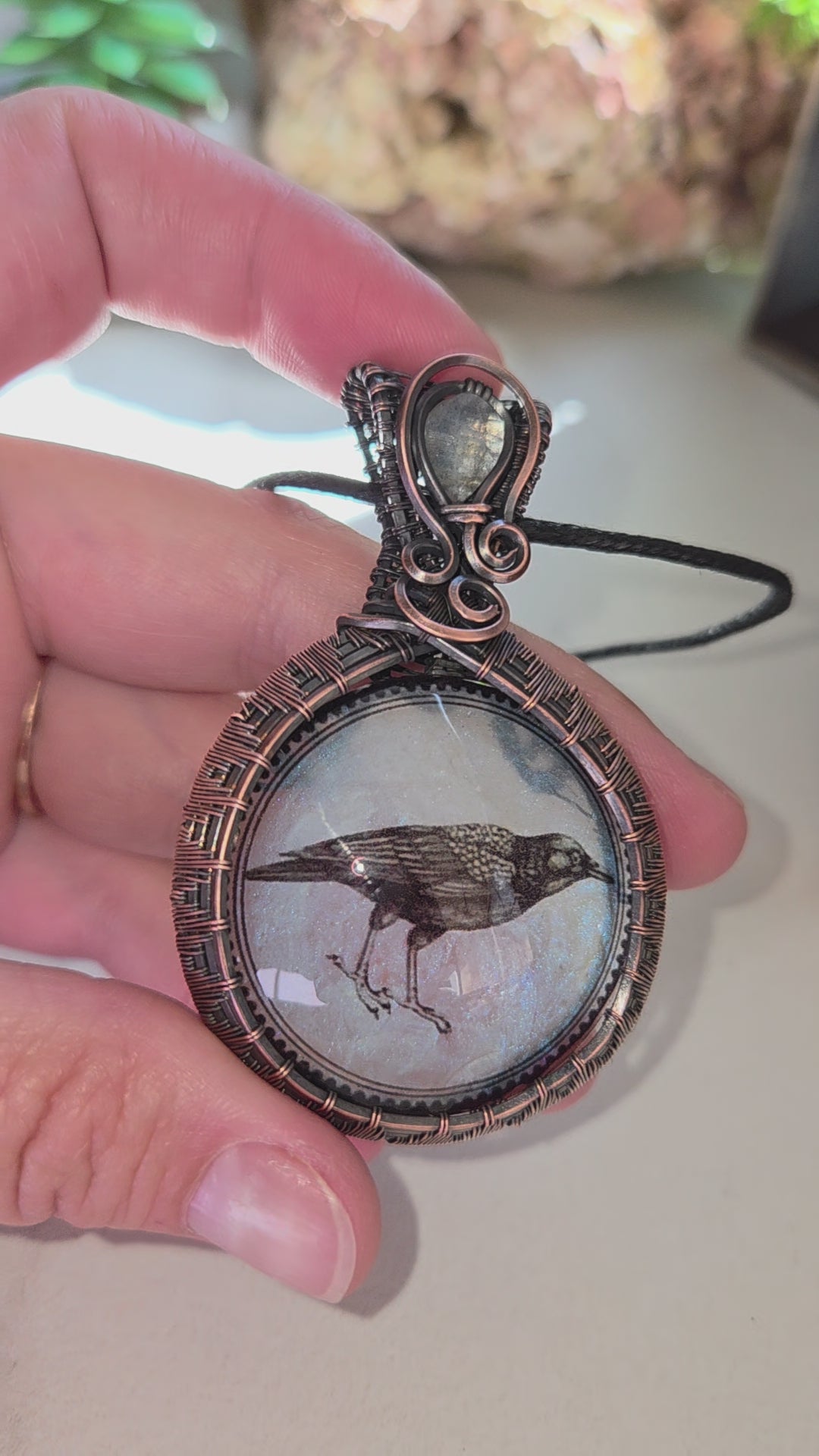 This striking necklace features a glass crow cabochon backed with shimmering blue translucent mica powder, sealed with a clear flood coat for lasting brilliance. The cabochon is carefully wrapped in antiqued copper wire, giving it a rustic yet elegant finish. A piece of labradorite is incorporated into the design, adding both beauty and meaning. The pendant hangs from an adjustable sliding knot cotton cord, making it easy to wear at your desired length.