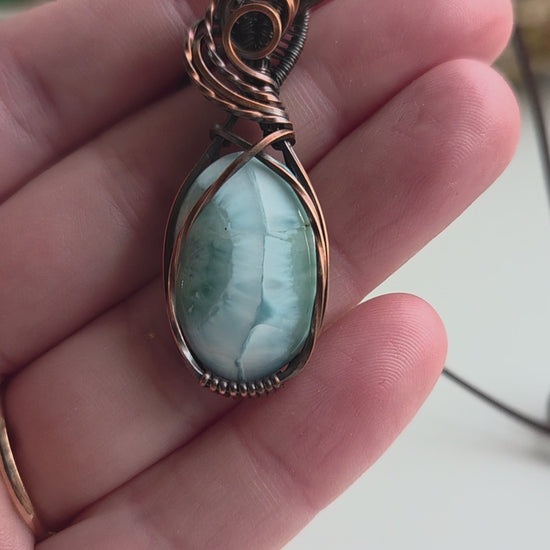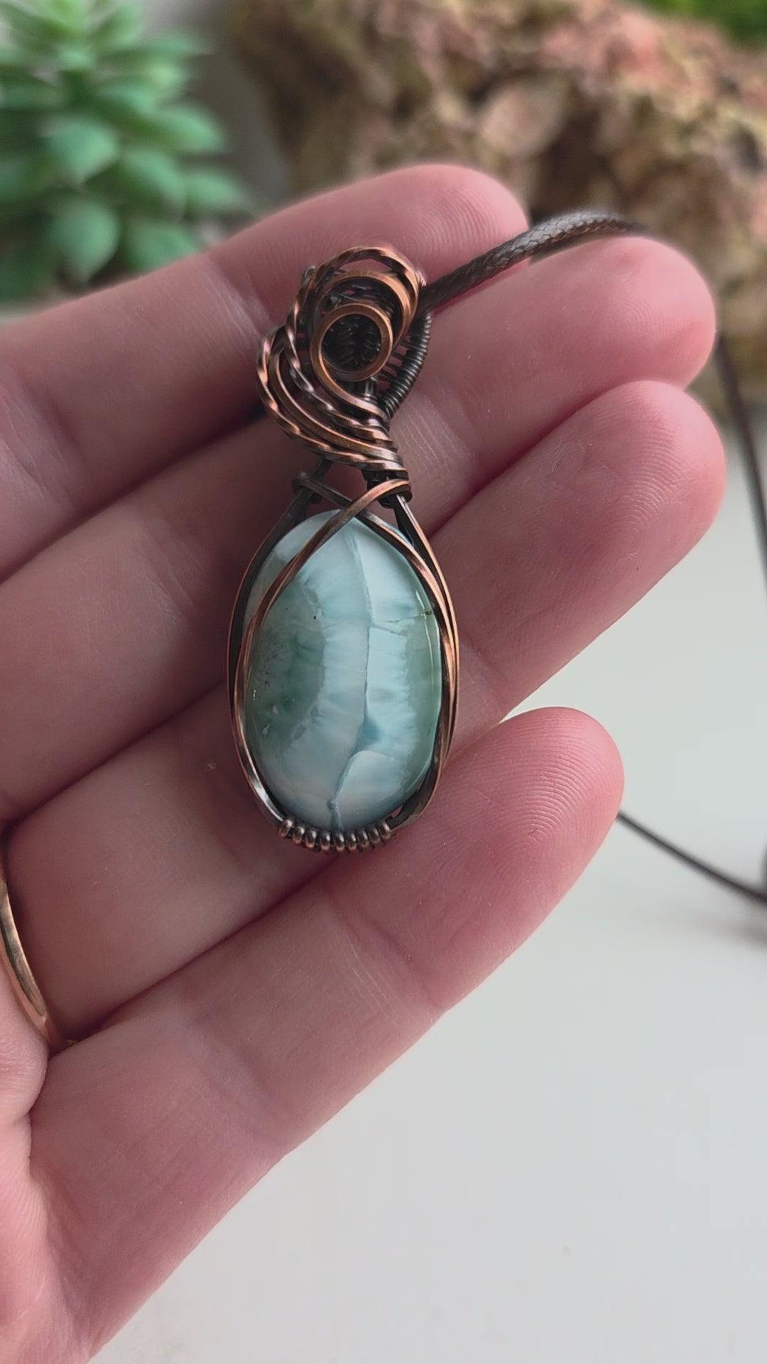 Embrace the soothing energy of the sea with this handcrafted Larimar necklace. Natural Larimar stone is carefully wrapped in antiqued copper wire, creating a beautiful contrast that highlights its tranquil ocean-blue tones. The pendant hangs on a brown waxed adjustable cord, allowing you to customize the length for your perfect fit and style.