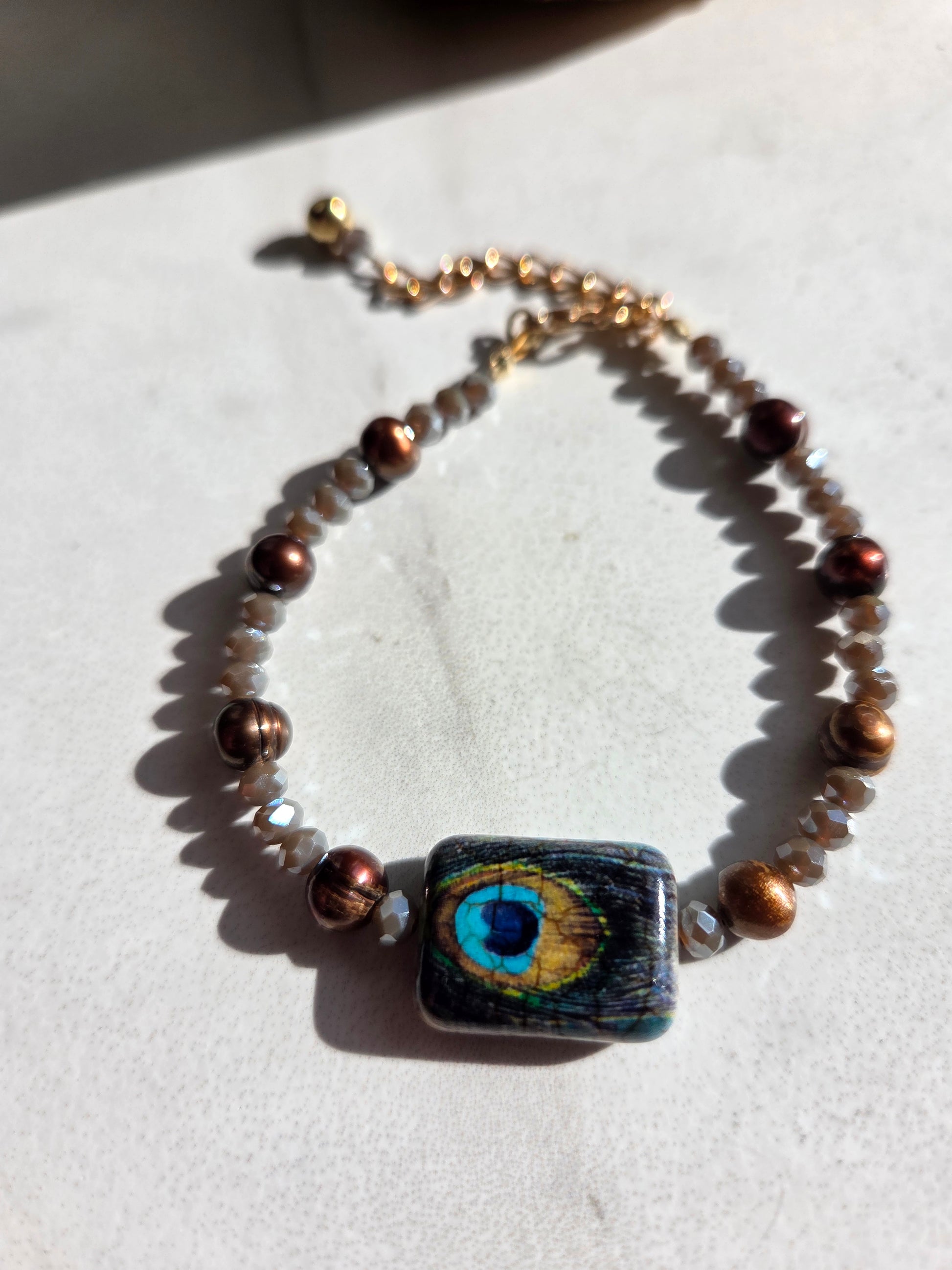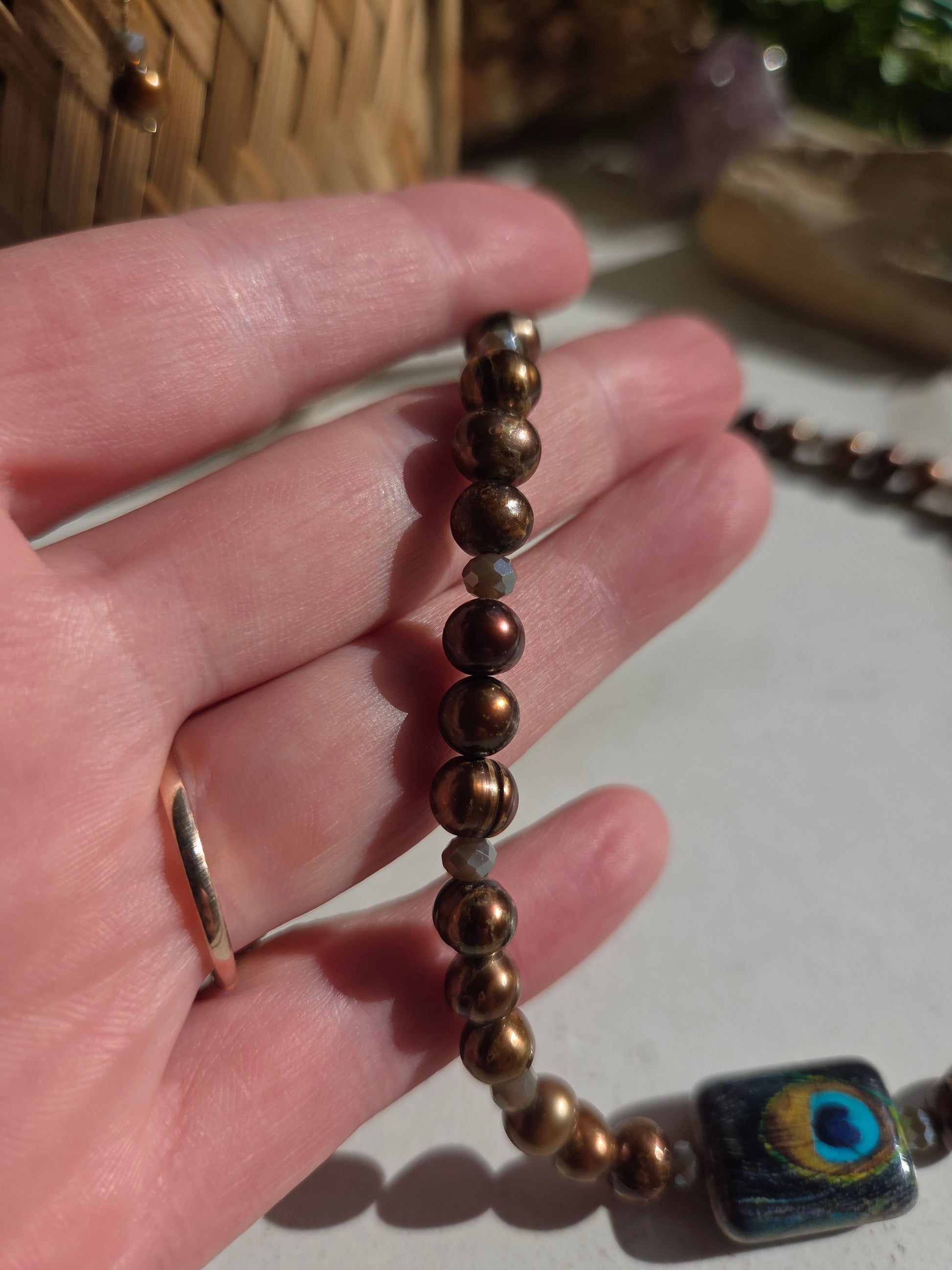 Make a bold yet elegant statement with this enchanting peacock freshwater pearl jewelry set, featuring a coordinating necklace, bracelet, and earrings. Each piece is thoughtfully handcrafted with soft brown freshwater pearls, sparkling glass beads for a hint of shimmer, and a striking reconstituted howlite peacock bead as a unique focal point.