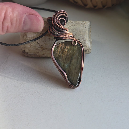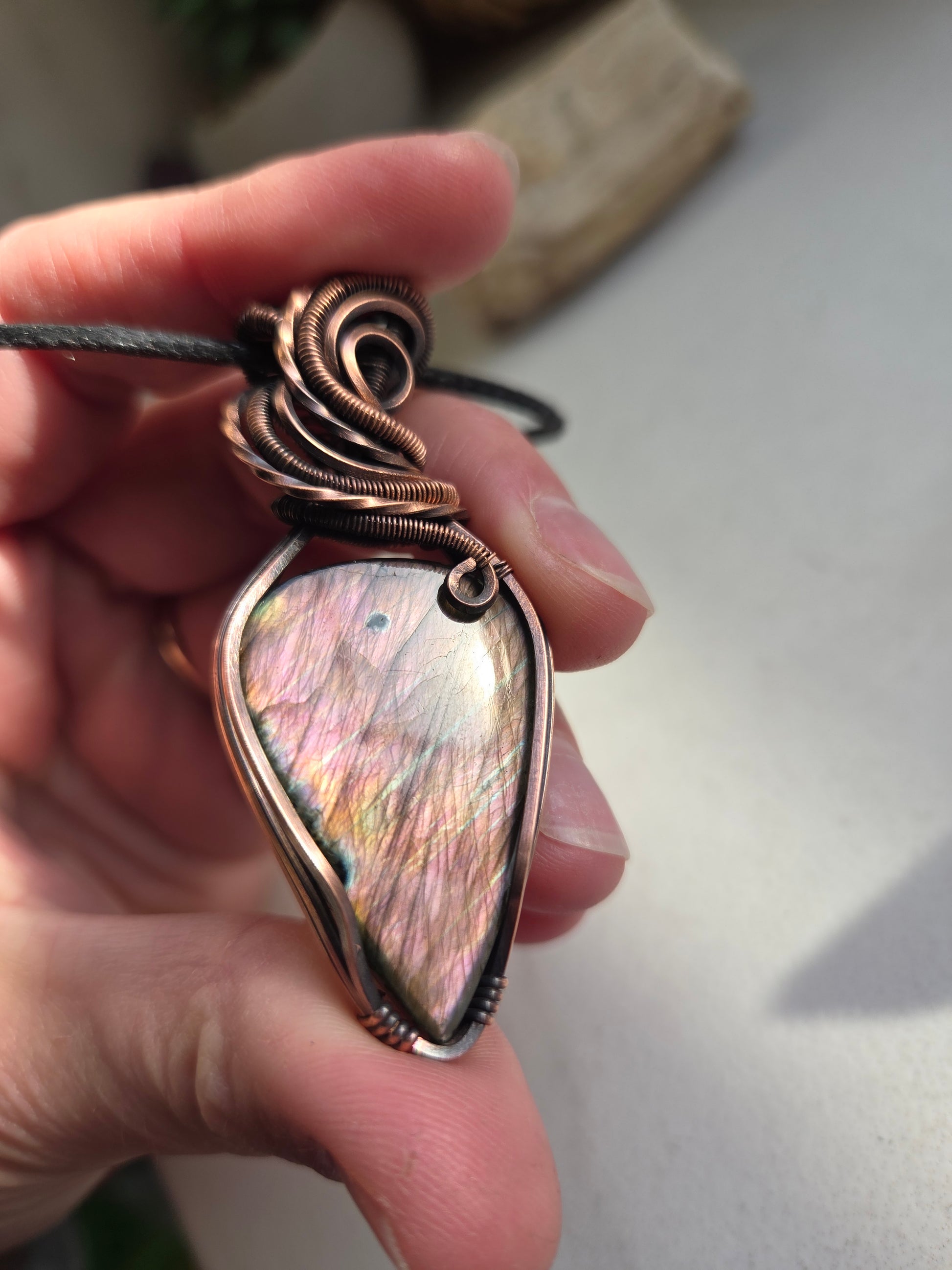 Embrace the magic of transformation with this stunning Purple Labradorite Necklace. Featuring a naturally flashy purple labradorite stone, carefully wire-wrapped in antiqued copper wire, this piece captures light and energy from every angle. The pendant hangs from an adjustable sliding knot cotton cord, offering a comfortable and versatile fit with a rustic, handcrafted charm.