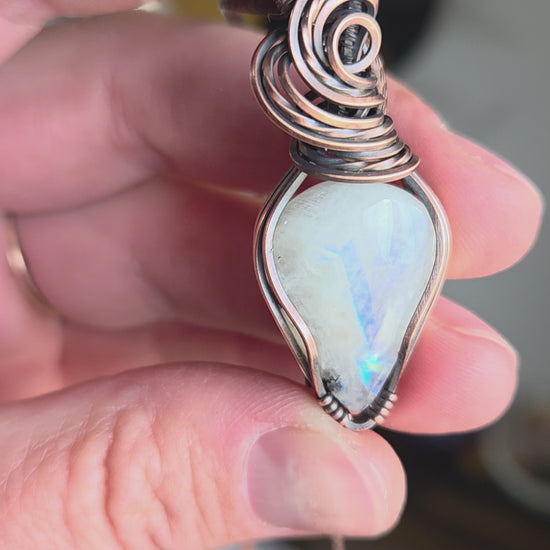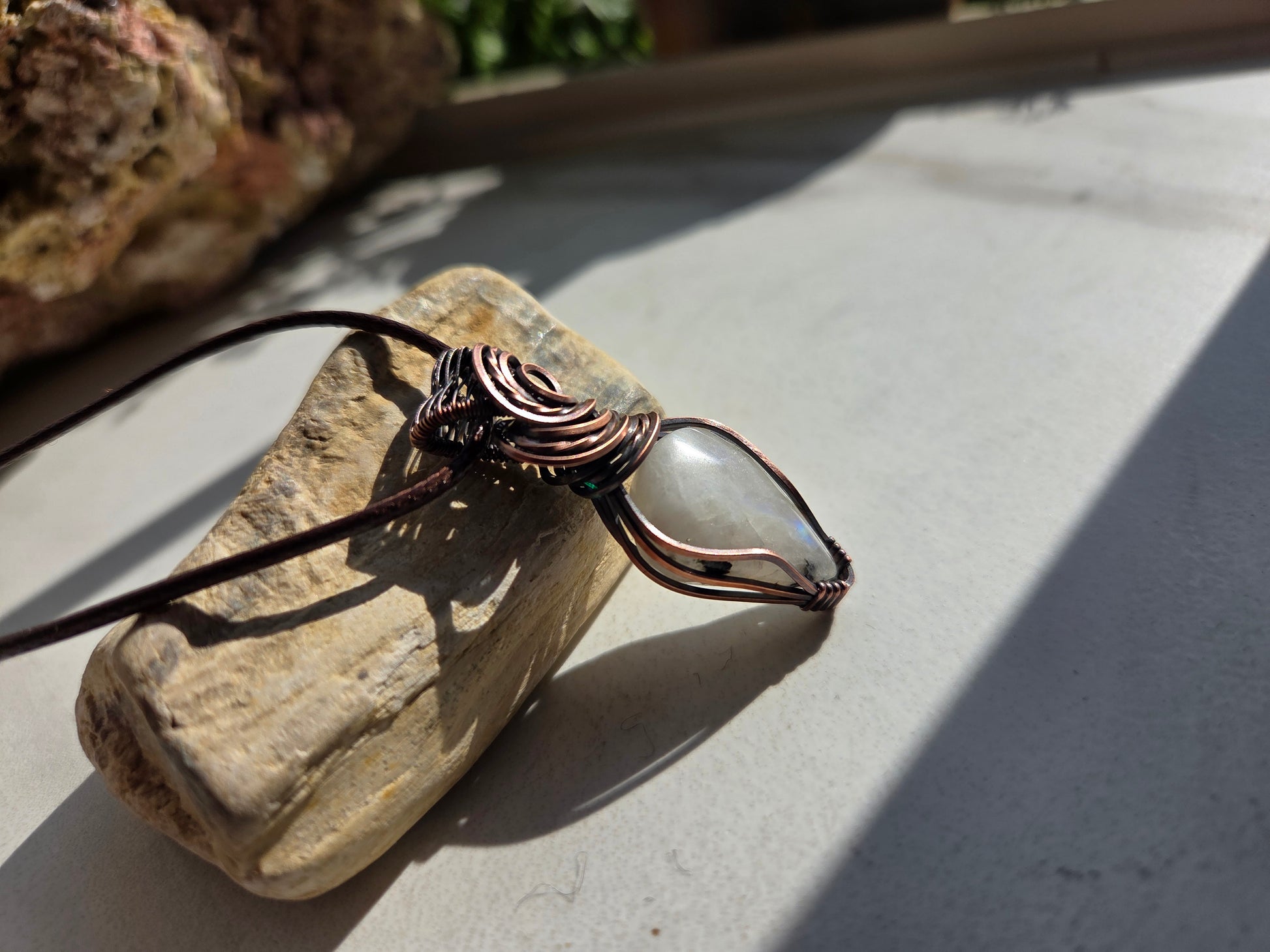 This enchanting necklace features a luminous rainbow moonstone with a bright blue flash, beautifully wrapped in antiqued copper wire to highlight its natural glow and iridescent energy. Hung on a brown adjustable waxed cord, it’s a timeless and versatile piece that’s perfect for daily wear or spiritual practice.