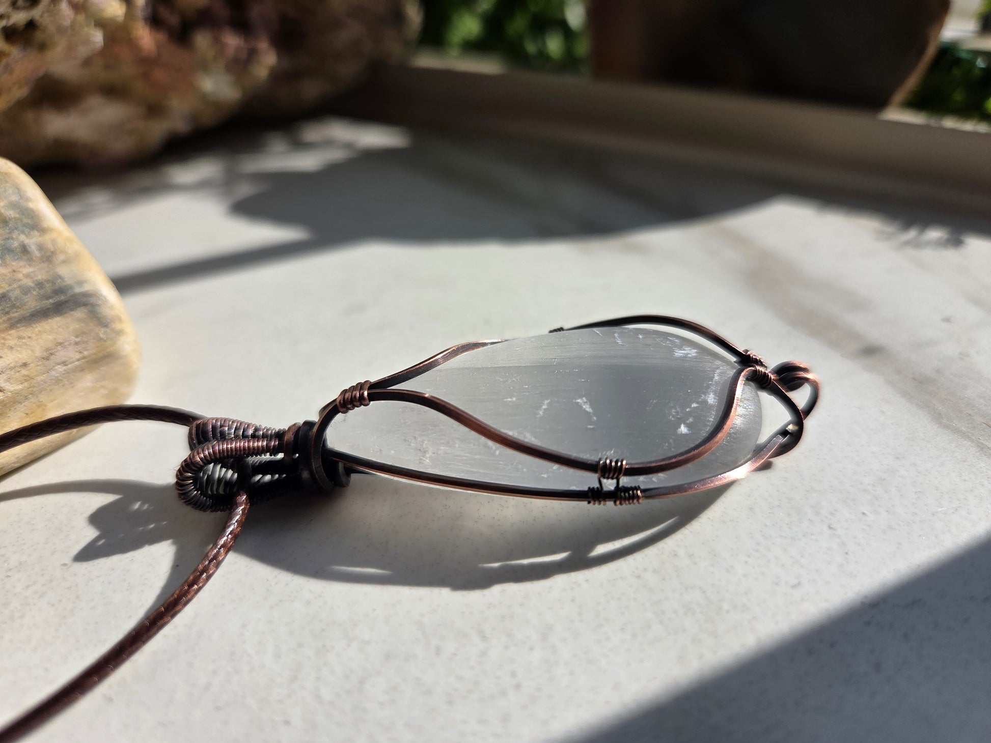 This elegant and minimalist necklace features a natural selenite crystal, simply wrapped in antiqued copper wire to showcase its natural beauty and luminous glow. Suspended from a brown adjustable waxed cord, it’s lightweight, versatile, and perfect for everyday wear or spiritual practice.